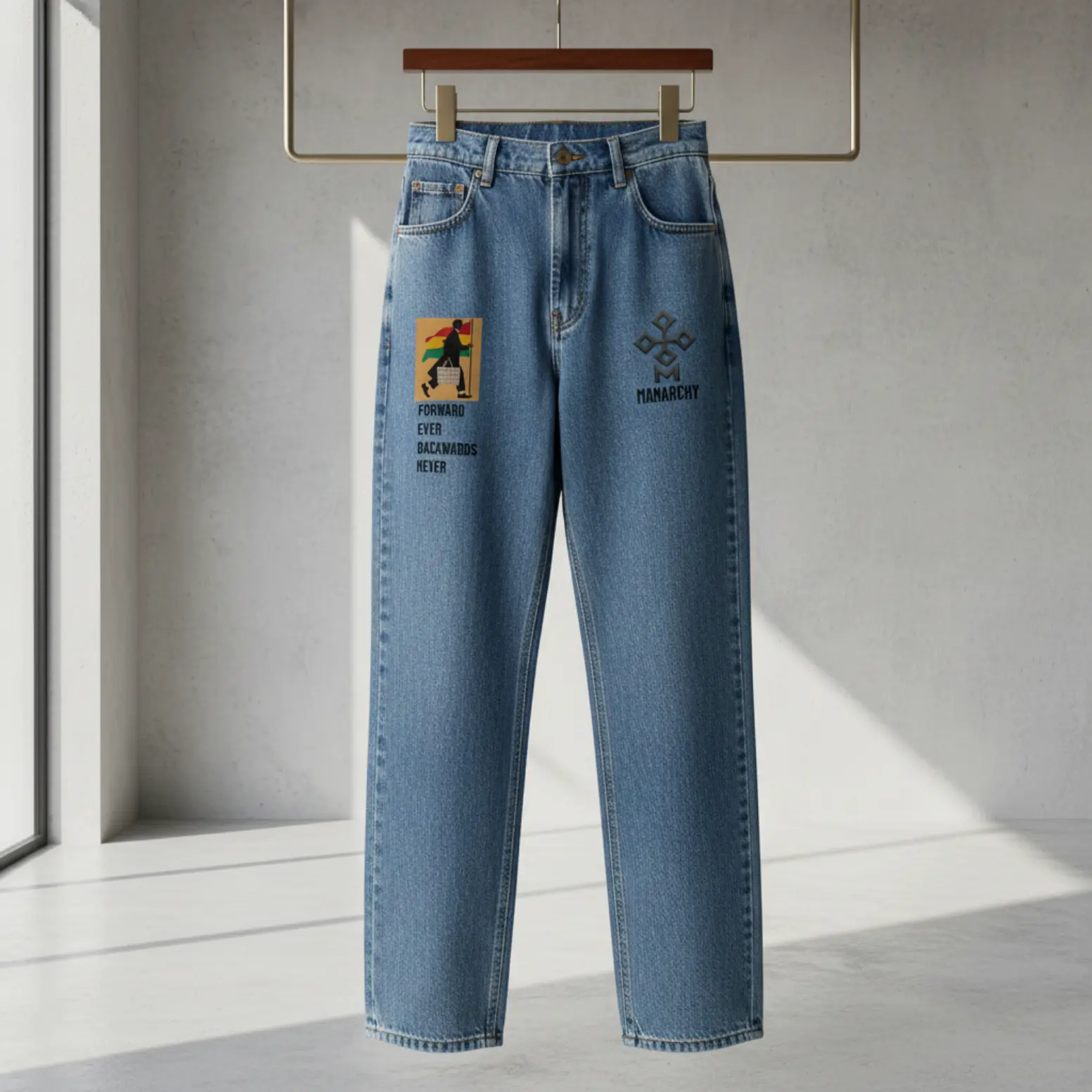 These classic straight-leg jeans are constructed from durable denim with a traditional high-waisted silhouette and a standard five-pocket design. The trousers feature a clean-cut hemline and are finished with contrast stitching and a secure button-and-zip fly closure. The front of the jeans is detailed with signature branding: the right thigh displays a vibrant illustrative patch depicting a figure with a flag alongside the motivational “FORWARD EVER BACKWARDS NEVER” slogan, while the left thigh features a tonal geometric “MANARCHY” emblem.