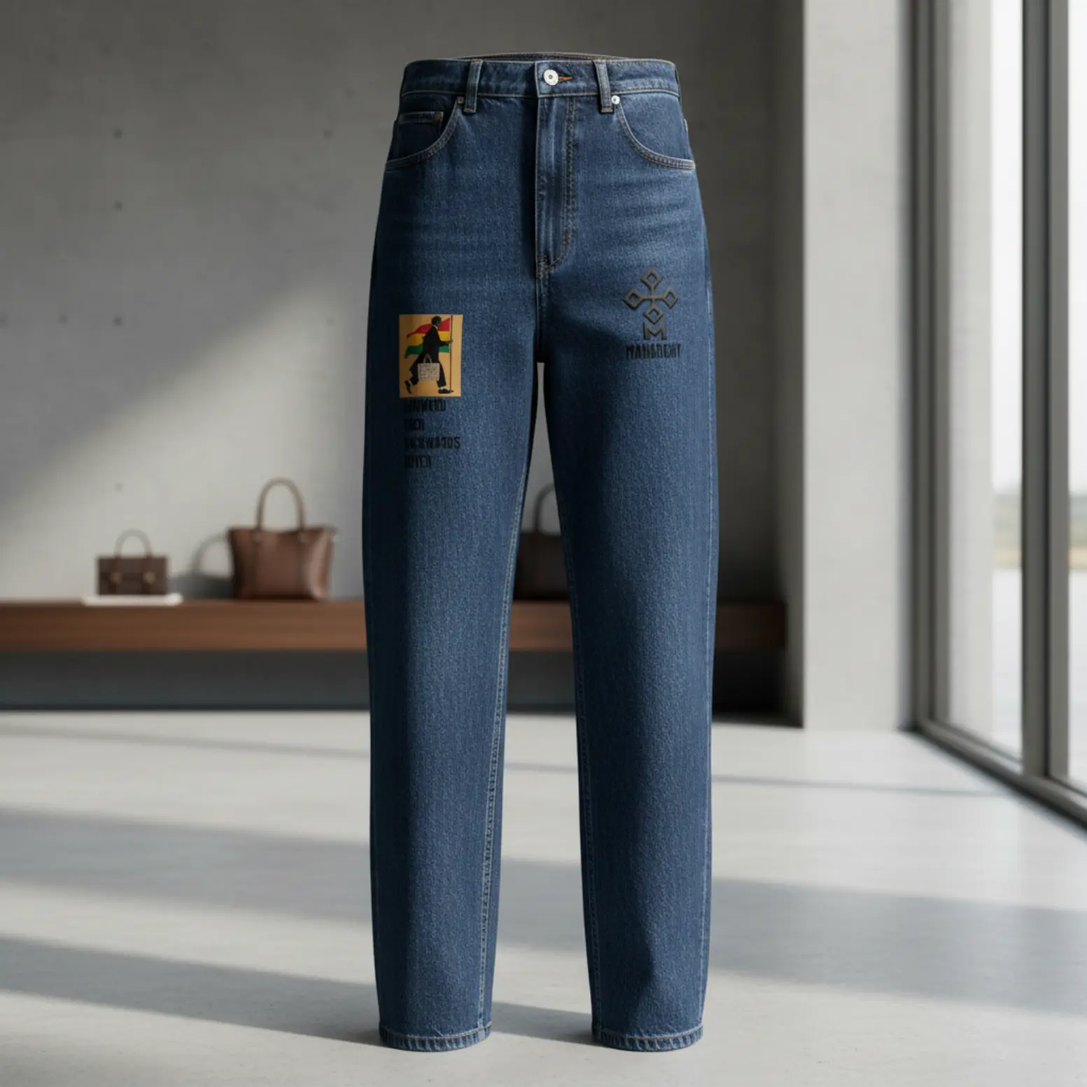These classic straight-leg jeans are constructed from durable denim with a traditional high-waisted silhouette and a standard five-pocket design. The trousers feature a clean-cut hemline and are finished with contrast stitching and a secure button-and-zip fly closure. The front of the jeans is detailed with signature branding: the right thigh displays a vibrant illustrative patch depicting a figure with a flag alongside the motivational “FORWARD EVER BACKWARDS NEVER” slogan, while the left thigh features a tonal geometric “MANARCHY” emblem.
