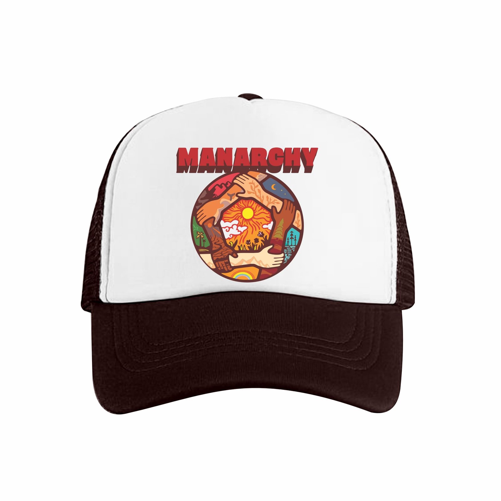 Celebrate connection and community with the Manarchy Unity Circle cap. This intricate design showcases diverse hands joining together in a circle over a backdrop of sun-drenched landscapes and starry nights. Topped with the Manarchy logo and finished with a rich brown/burgundy mesh, this hat is a powerful statement piece about togetherness and the natural world.