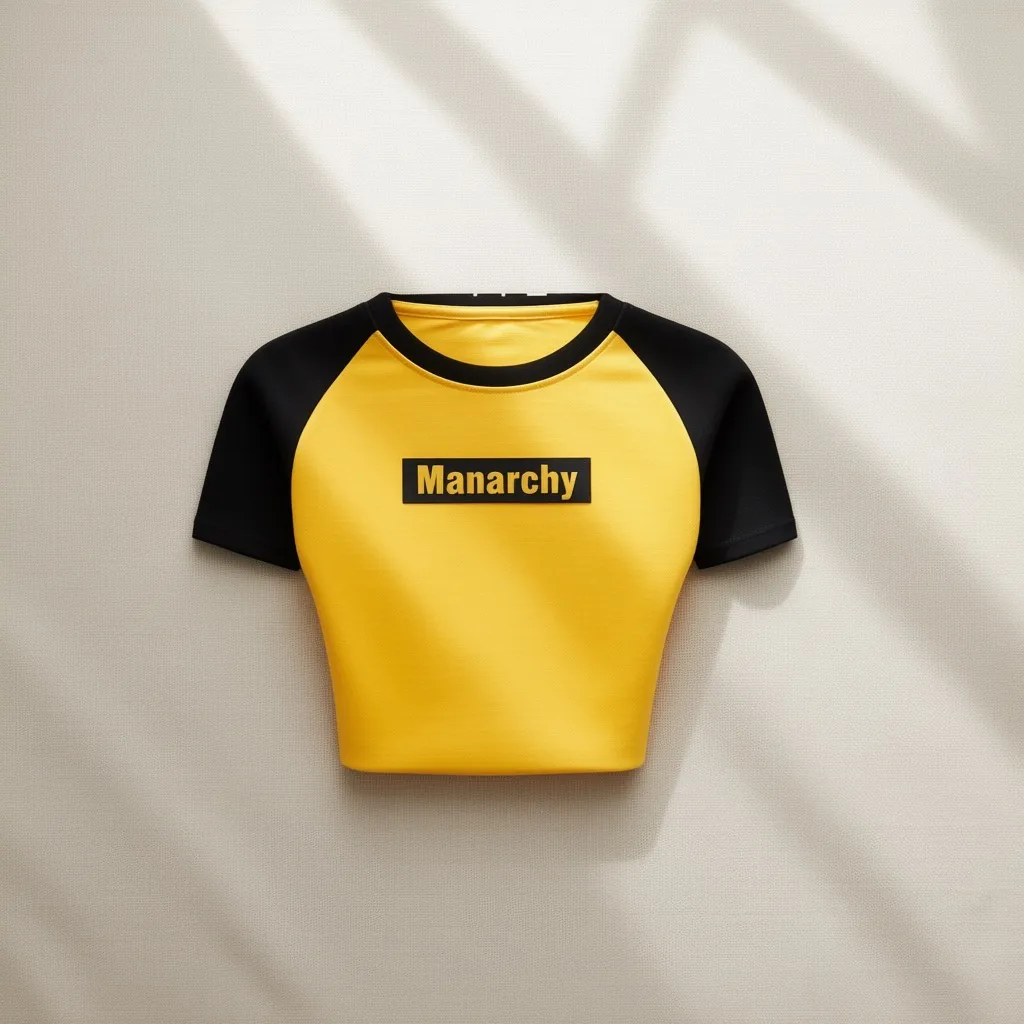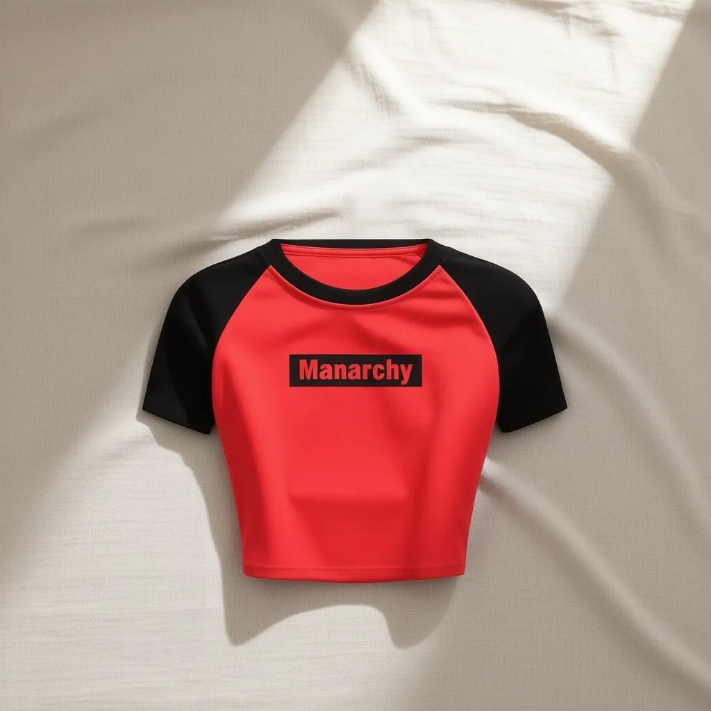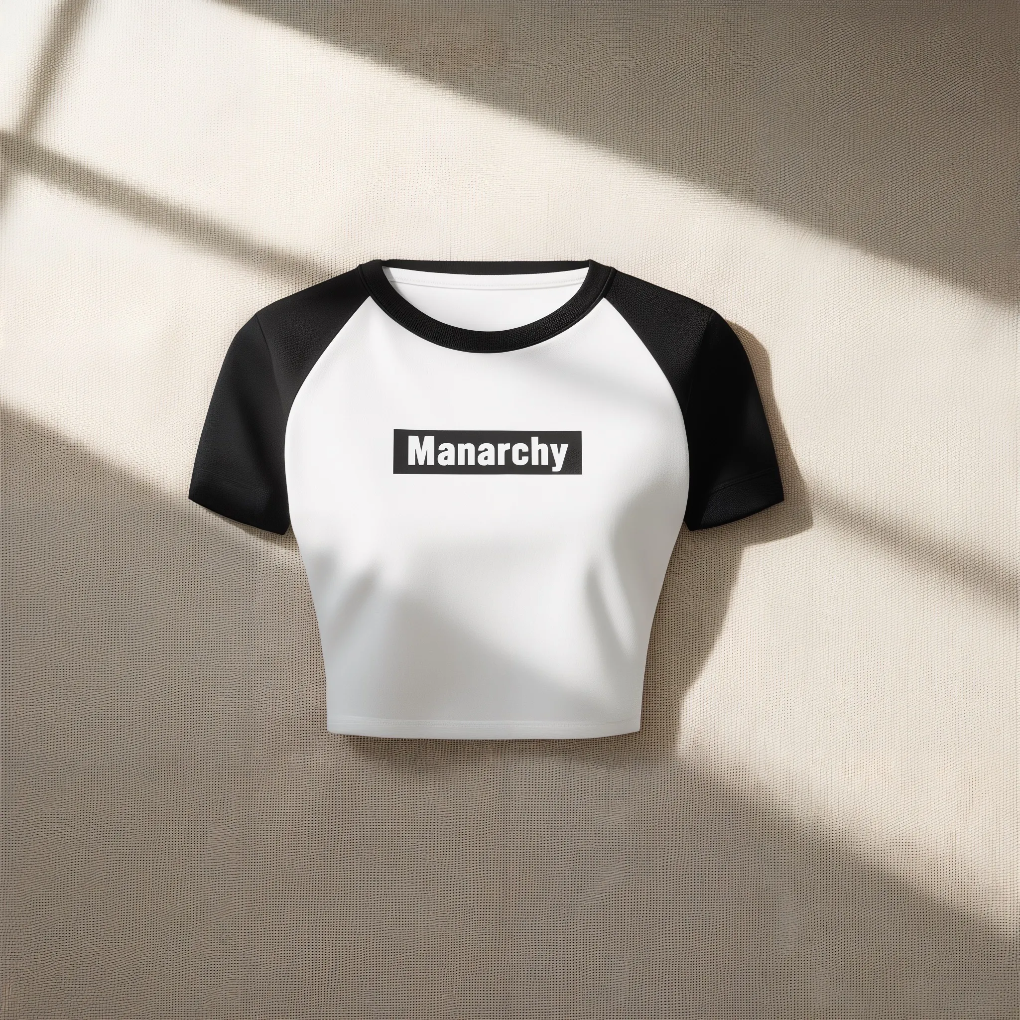 A sleek, athletic-inspired raglan crop top featuring a classic two-tone design. This short-sleeved top is constructed with a contrasting crew neckline and sleeves that extend to the collar, creating a sporty silhouette. The center chest is detailed with a bold, rectangular “Manarchy” box logo in high-contrast typography. Made from a smooth, form-fitting stretch fabric, the garment features a clean-cut cropped hemline designed to sit comfortably above the waist.