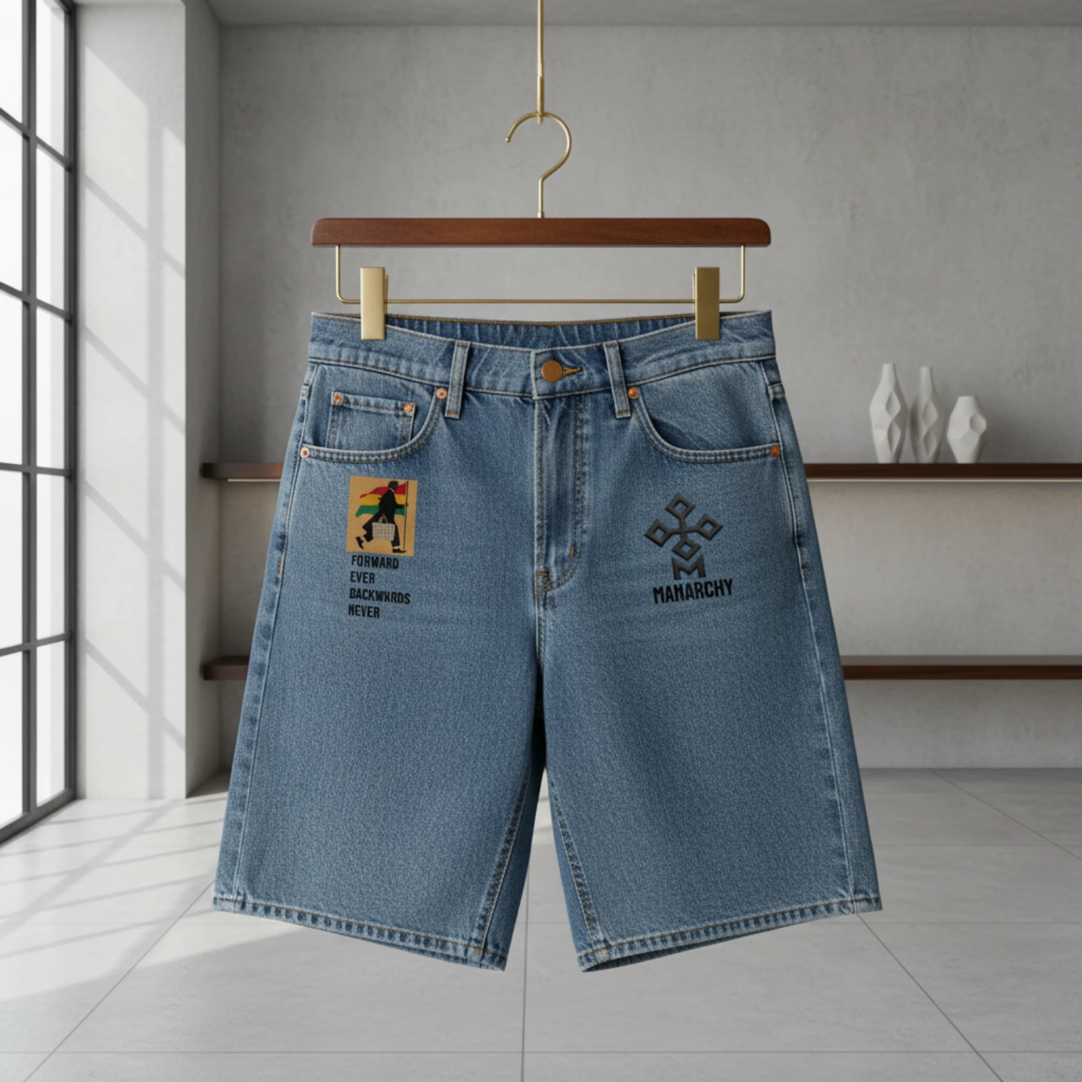 The Manarchy Legacy Armor Denim Jean Shorts bring a rugged, high-street edge to warm-weather dressing. Crafted from premium, mid-wash blue denim, these shorts feature a relaxed straight-leg cut that balances vintage aesthetic with modern urban branding. The right thigh is detailed with the collection’s signature tricolor traveler graphic and the iconic “FORWARD EVER BACKWARDS NEVER” mantra. Complementing this is the bold, black Manarchy geometric sigil on the left leg, adding a distinctive mark of the brand’s identity.