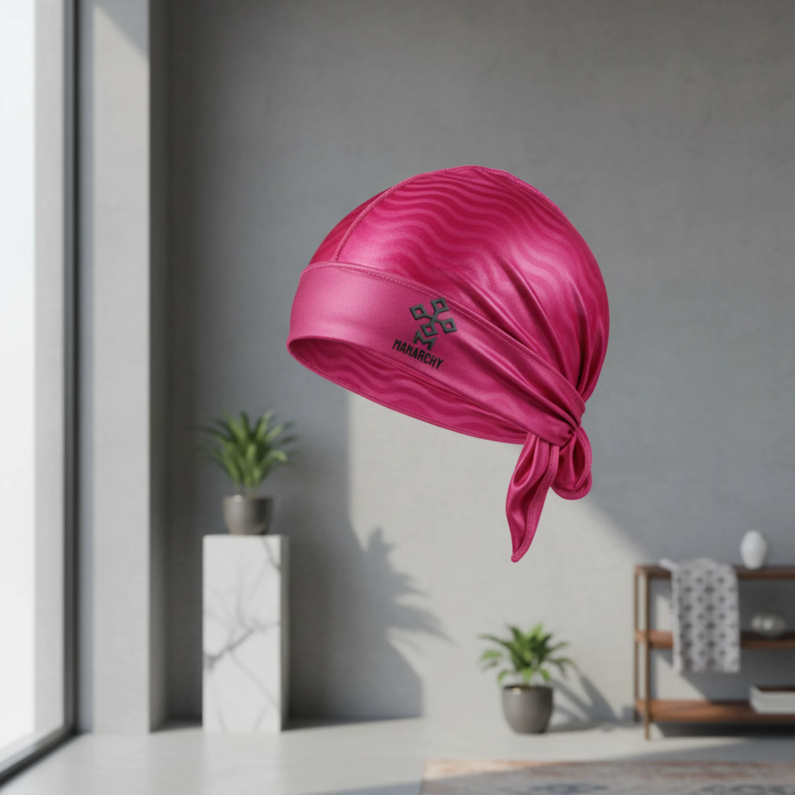 Complete your look with the Manarchy Legacy Armor Silk Durag. This premium headwear piece, finished in a vibrant fuchsia pink, combines luxury hair protection with high-end streetwear aesthetics. The fabric features a subtle, tonal wave pattern throughout, giving the material a rich, multidimensional texture that catches the light. The front headband is anchored by the black Manarchy geometric sigil, providing a sharp, high-contrast focal point that represents the brand’s heritage and structural design.