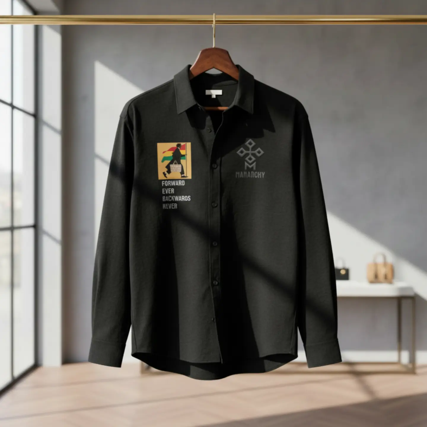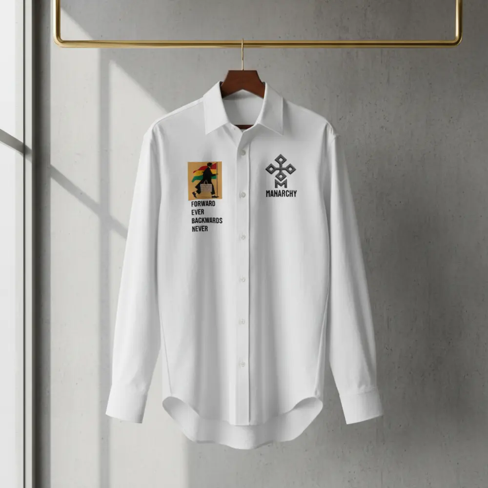 This is a premium, long-sleeved button-down shirt in a textured fabric. It features a modern, relaxed collar and a clean button placket. The garment is distinguished by two unique graphic elements: on the left chest, a grey geometric emblem sits above the text “MANARCHY”; on the right chest, a vibrant rectangular patch depicts a figure walking with a flag, accompanied by the bold inspirational quote, “FORWARD EVER BACKWARDS NEVER.” The shirt has a slightly curved hemline, making it ideal for both tucked and untucked styling.