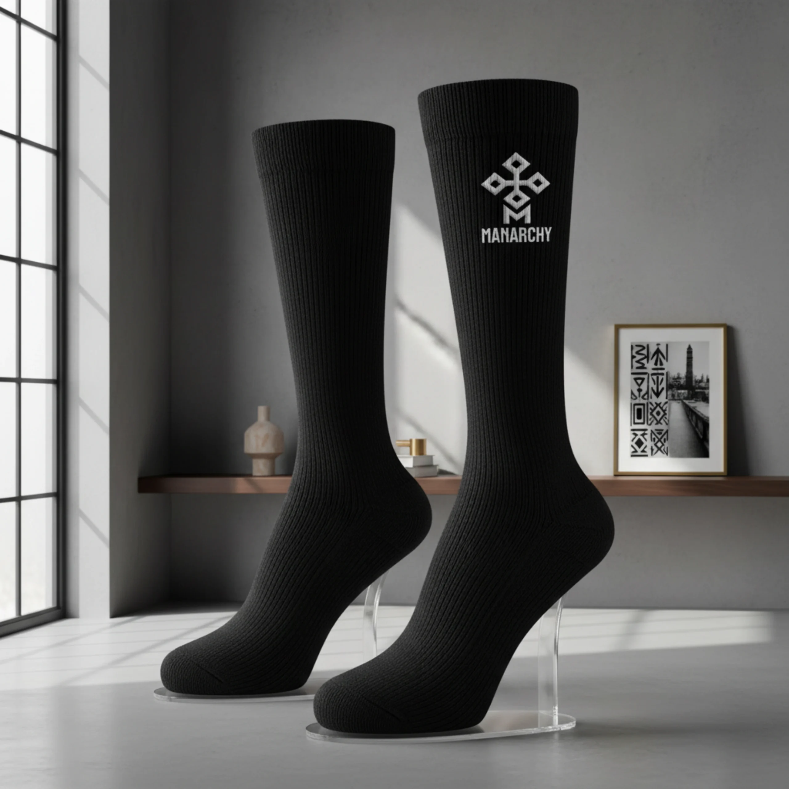 Crafted with a focus on both comfort and durability, these socks feature a high-stretch ribbed construction that ensures they stay in place throughout the day. The reinforced heel and toe areas provide extra cushioning, making them the perfect companion for high-top sneakers or boots. Whether worn pulled high for a bold look or layered under trousers, these socks are an essential detail for the complete Manarchy uniform.