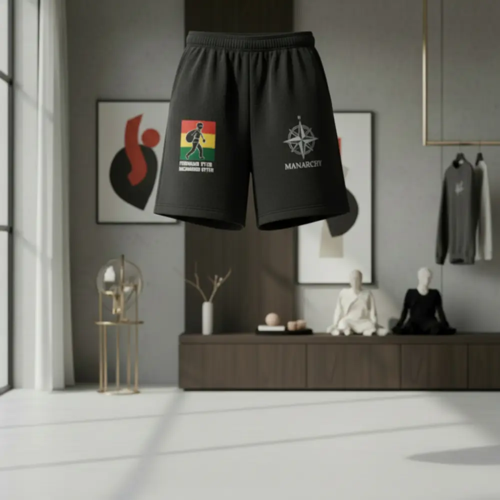 Step into ultimate comfort with the Manarchy Essential Graphic Shorts. Part of the exclusive Monarch Cross collection, these shorts are engineered for both high-intensity movement and relaxed urban lounging. Featuring a premium matte black finish, the right leg showcases a vibrant Red, Gold, and Green graphic patch with a silhouette representing the journey of the modern monarch. The left leg is anchored by the signature white Manarchy compass logo, symbolizing direction and purpose.