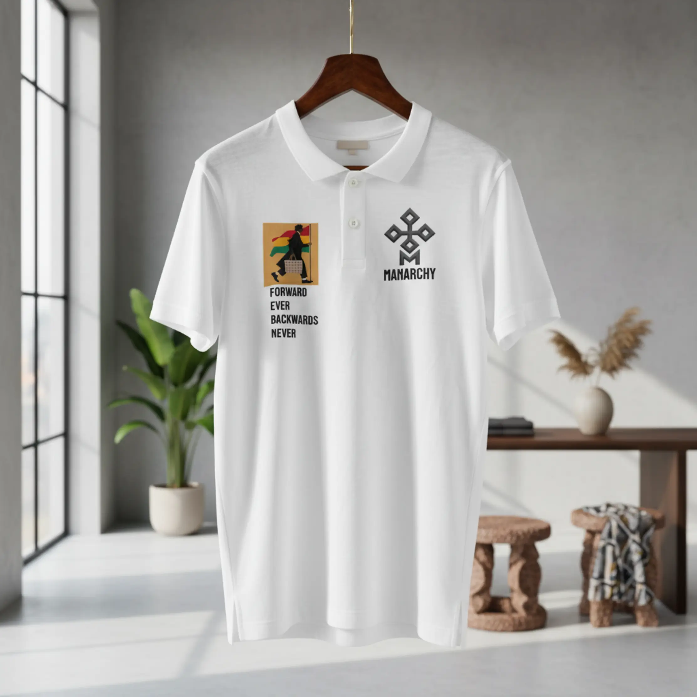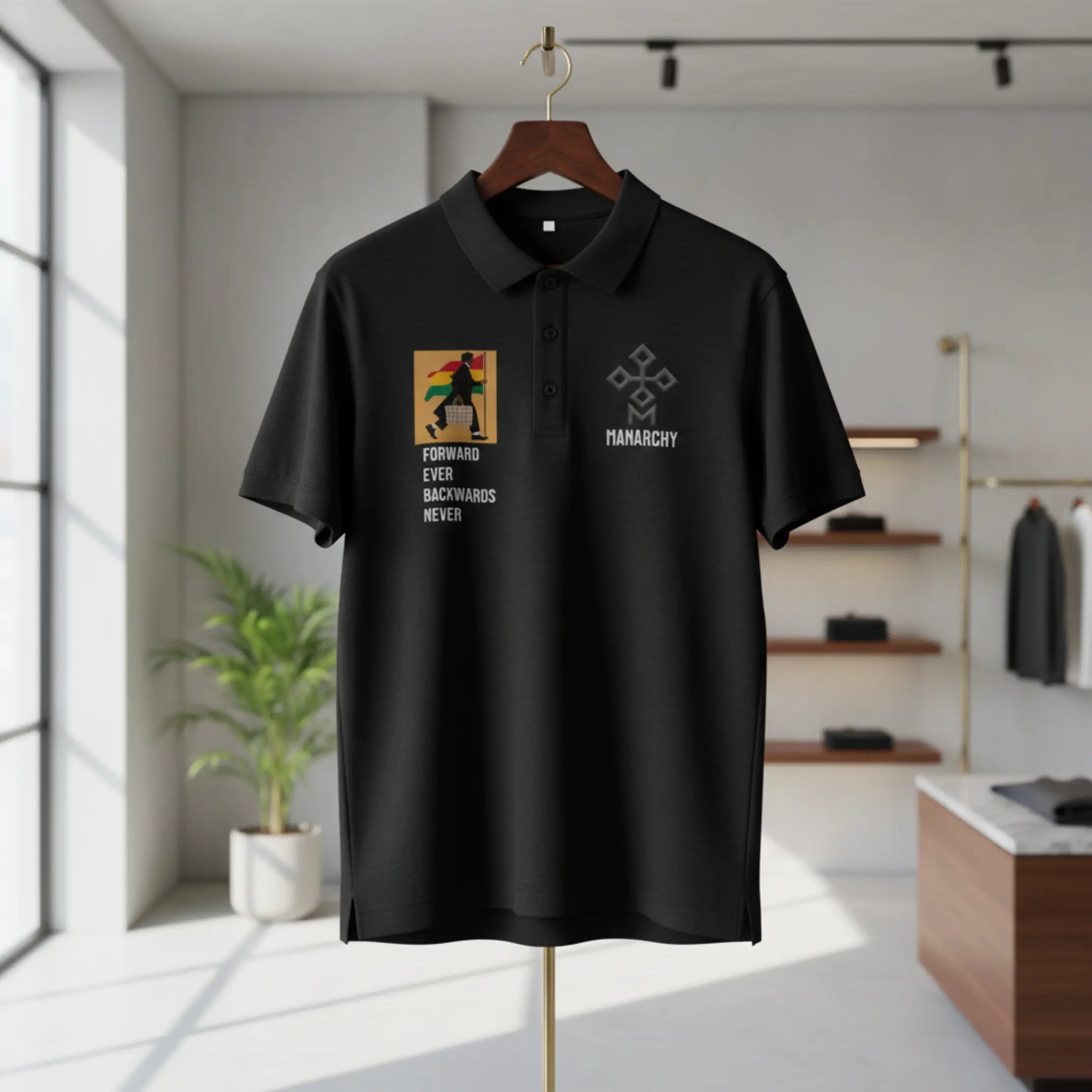 The Manarchy Legacy Armor Polo represents a seamless blend of classic athletic silhouettes and contemporary urban messaging. This short-sleeve polo shirt, finished in a deep black, features a traditional three-button placket and a crisp ribbed collar for a structured, polished look. The right chest is detailed with the Legacy Armor traveler graphic atop a vibrant tricolor field, accompanied by the definitive “FORWARD EVER BACKWARDS NEVER” credo. The left chest is anchored by the Manarchy geometric sigil, providing a sharp, high-contrast mark of structural luxury.