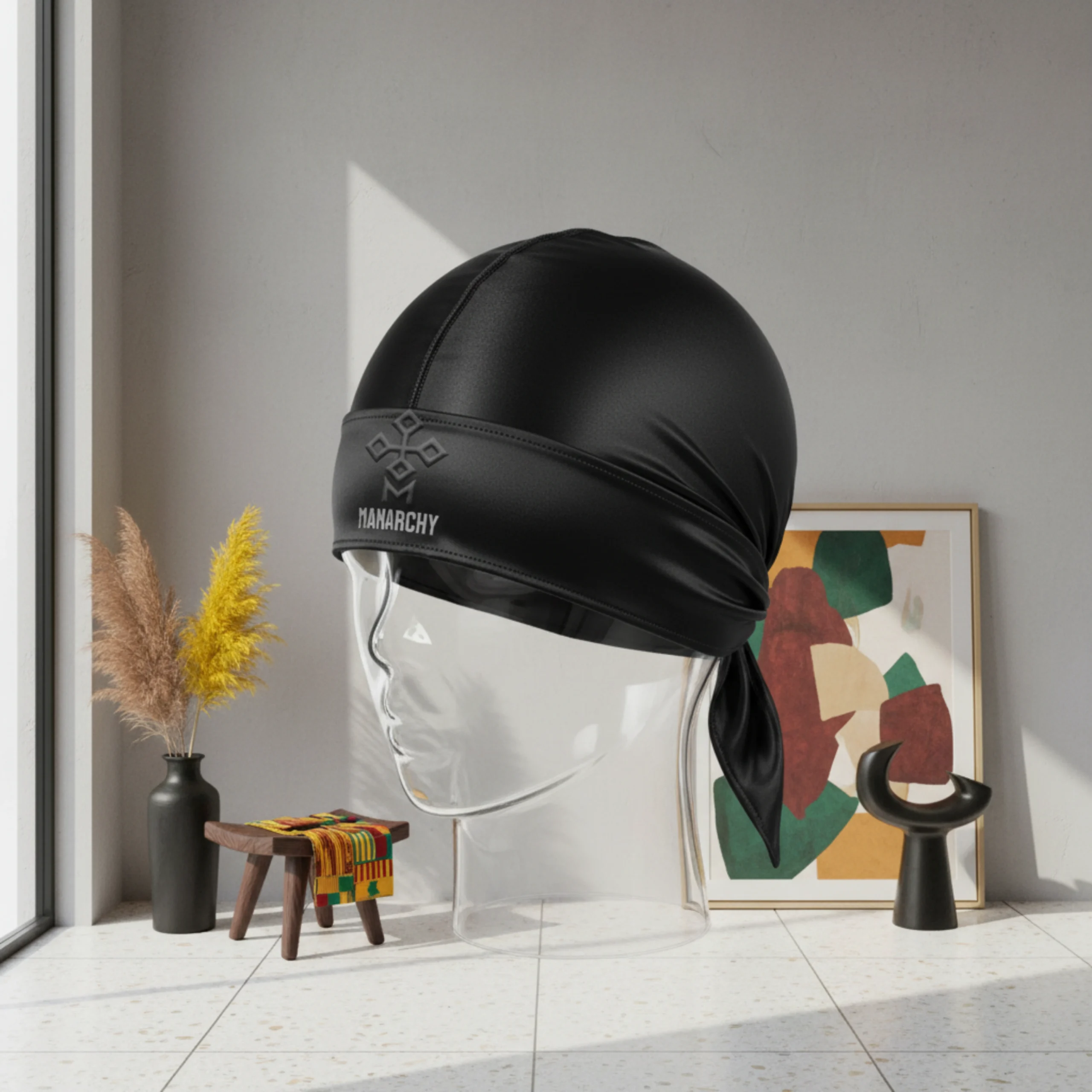 Complete your look with the Manarchy Legacy Armor Silk Durag. This premium headwear piece, finished in a vibrant black, combines luxury hair protection with high-end streetwear aesthetics. The fabric features a subtle, tonal wave pattern throughout, giving the material a rich, multidimensional texture that catches the light.