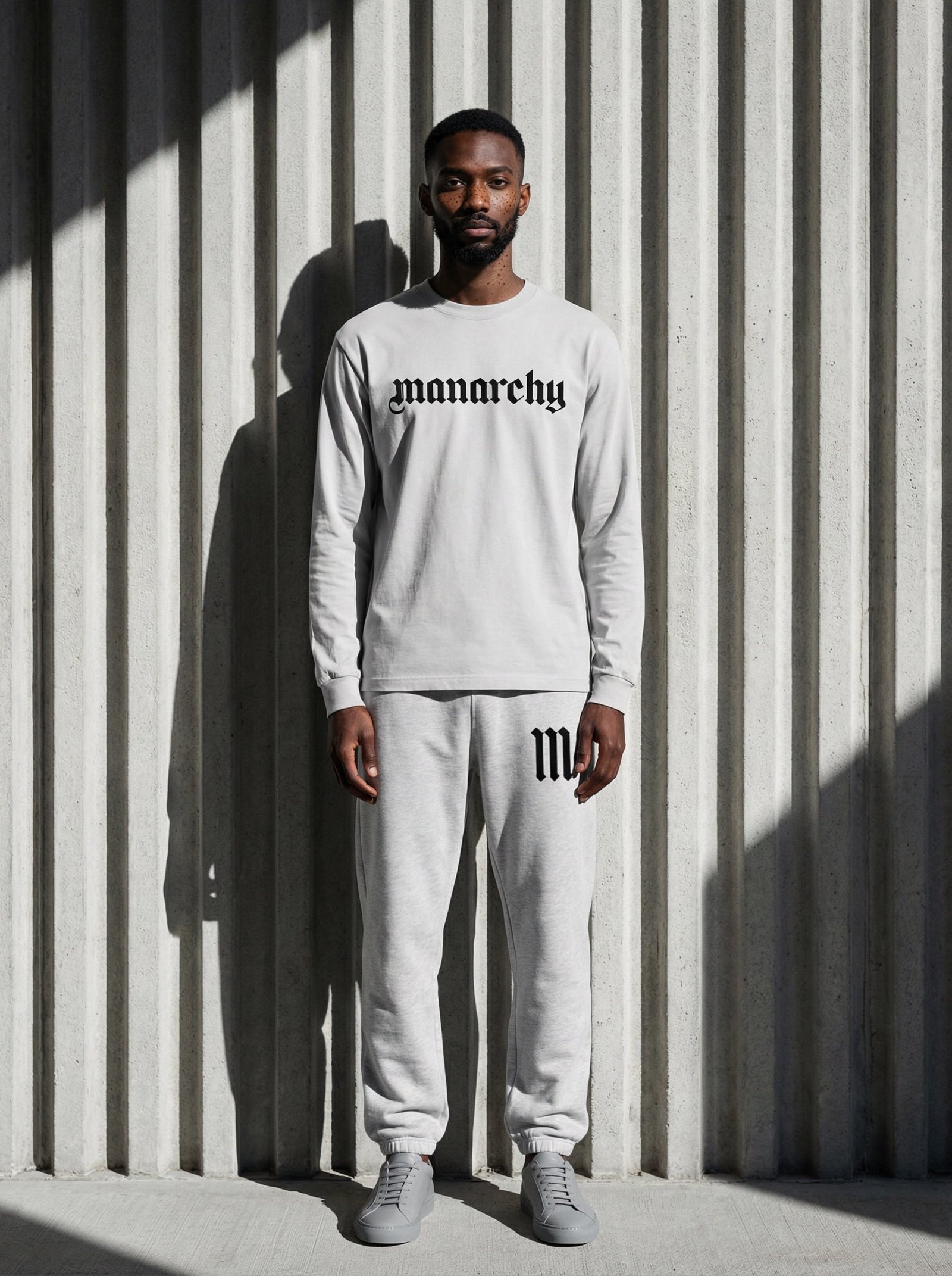This heavyweight streetwear set features an oversized crewneck t-shirt and coordinating joggers. The t-shirt is designed with a relaxed, drop-shoulder silhouette and a bold, “MANARCHY” block logo across the chest. The matching joggers include an elasticated waistband with elongated contrast drawstrings. They are heavily detailed with a vertical “MANARCHY” wordmark in a bubble-style font down one leg, a gothic-inspired “M” initial on the hip, and a circular character graphic with a halo on the lower shin. Crafted for a modern urban aesthetic, this set combines high-impact typography with a comfortable, slouchy fit.