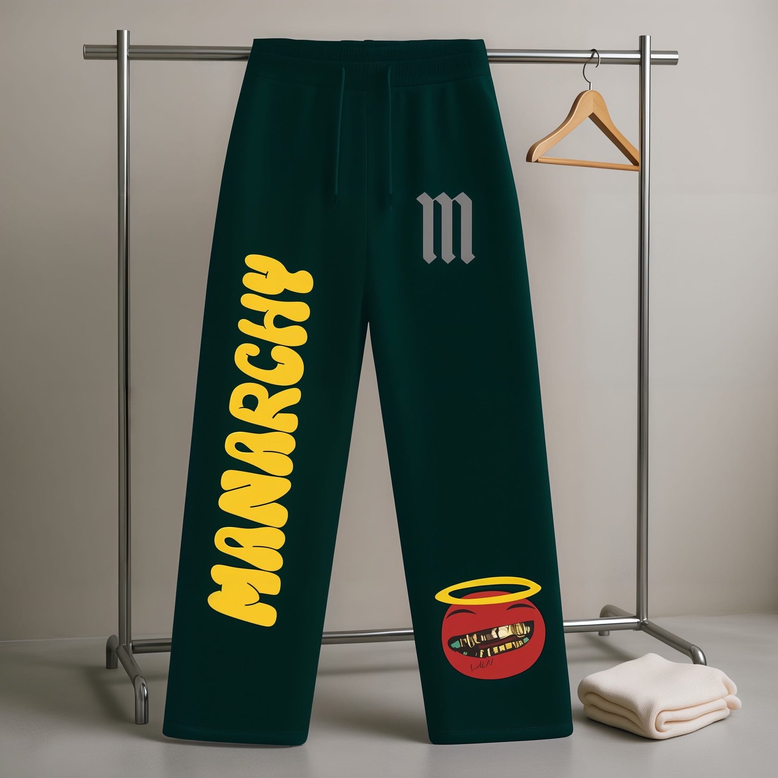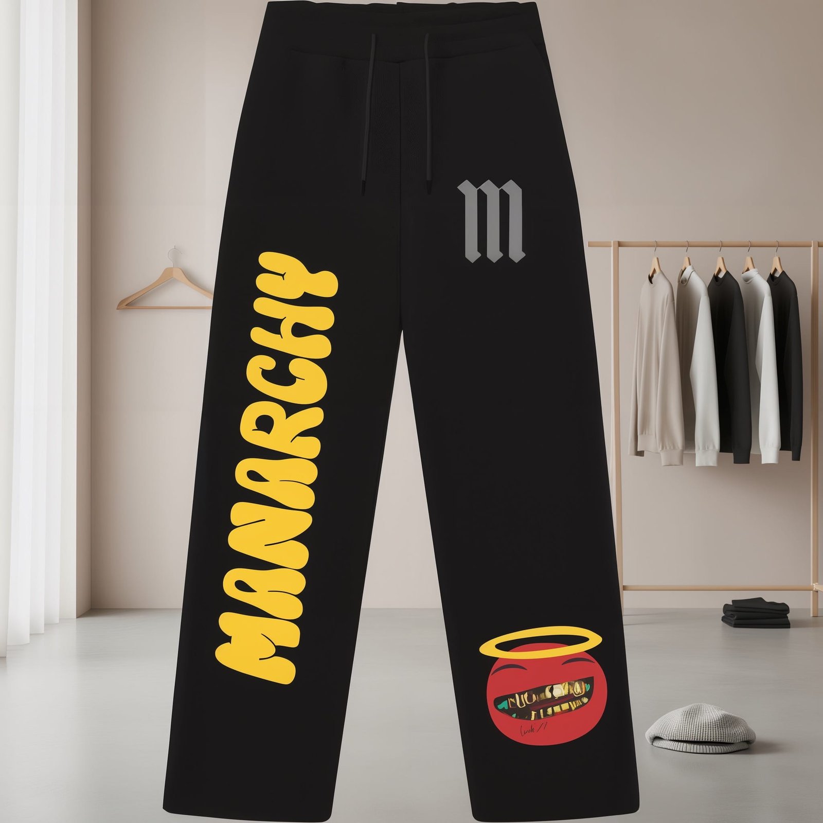 These relaxed-fit, wide-leg sweatpants are constructed from a premium heavyweight fleece fabric, designed for both comfort and a structured streetwear silhouette. The design features an elasticated waistband with adjustable tonal drawstrings for a customizable fit. High-impact branding is distributed across the garment: a large, vertical “MANARCHY” wordmark in a bold bubble-style font dominates the right leg, while a gothic-inspired “M” initial sits on the left hip. The lower left leg is accented with a vibrant circular character graphic featuring a golden halo and a detailed “grill” smile. This piece balances bold typography with playful illustrative elements for a standout urban look.