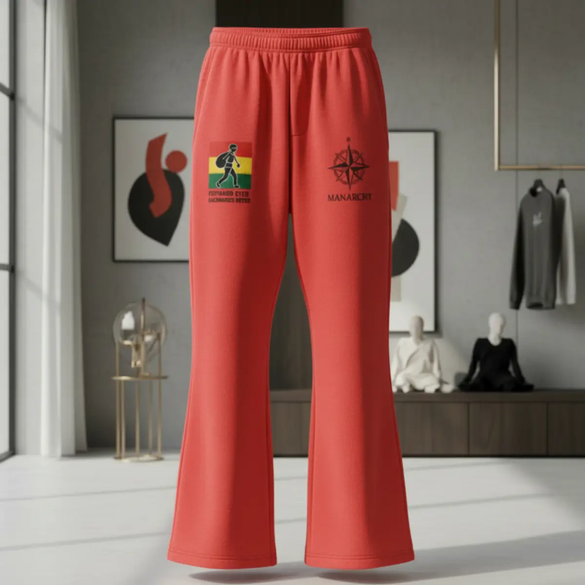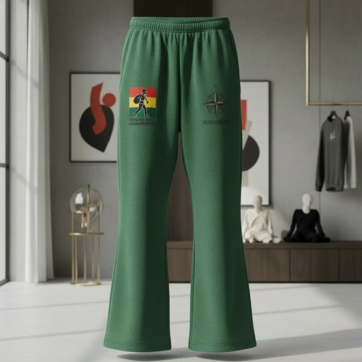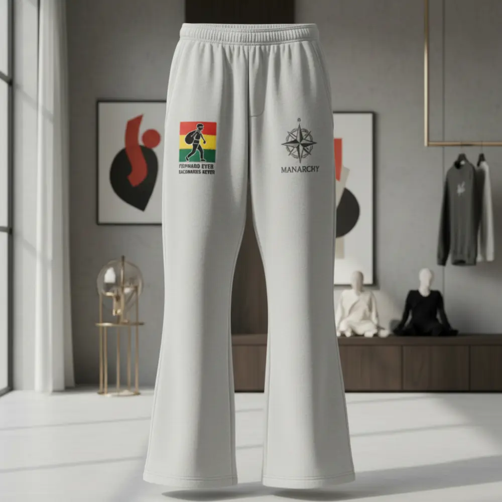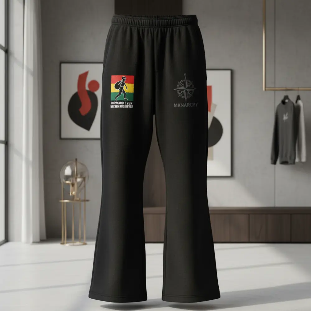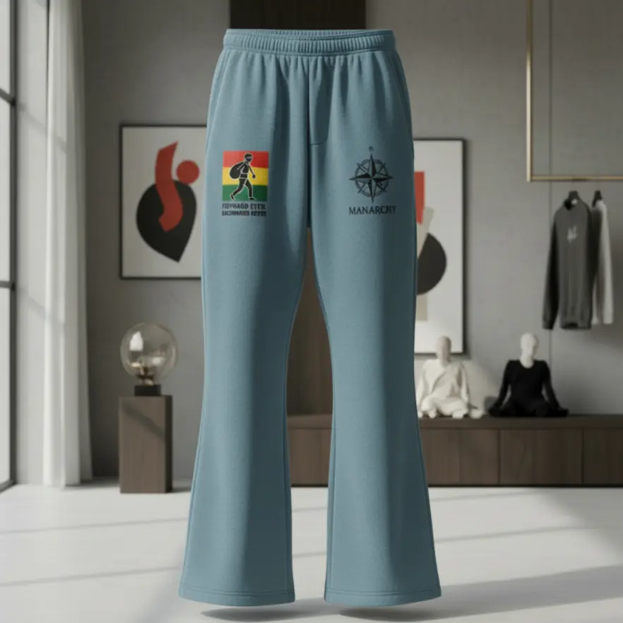 Redefine your silhouette with the Manarchy Flare-Leg Joggers in a striking slate blue. Moving away from traditional cuffed bottoms, these joggers feature a modern flared leg opening, creating a sophisticated draped effect that sits perfectly over sneakers. The right thigh carries the iconic tricolor traveler graphic, balanced by the black Manarchy compass logo on the left.